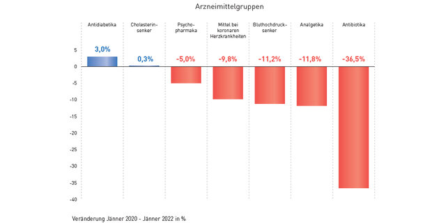 Veränderung Jänner 2022 versus Jänner 2020 bei an Apotheken gelieferten Arzneimittelpackungen (siehe auch Grafik):